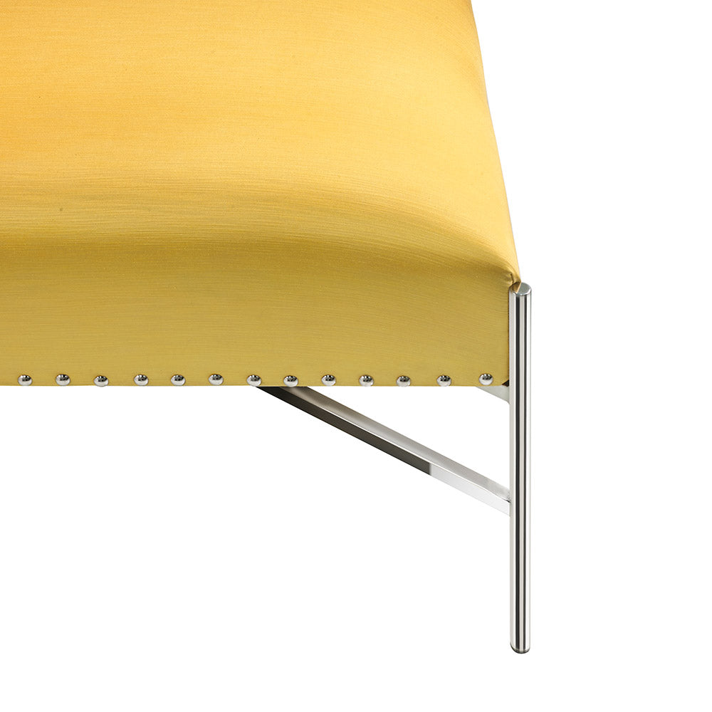 Instantly warm up any room with the Baringo accent chair. Modern slipper chair designed with a comfortable and vibrant yellow satin fabric. Use it as a reading chair, a lounge chair, or as an accent piece! The Baringo accent chair sits on a sturdy, x-shaped metal base. Exceptionally plush and perfect for your everyday needs. Armless design provides a range of seating options. Style it with a throw and footstool for an editorial look.