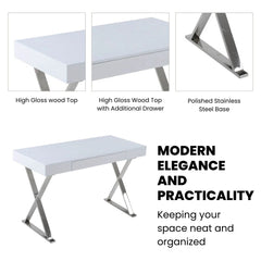 The Millie Console Table combines modern elegance with practicality. With a sleek white high gloss wood top, it exudes sophistication and contemporary charm. The addition of a drawer provides convenient storage space for various items, keeping your living area neat and organized. Supported by a polished stainless steel frame, this console table not only boasts durability but also adds a touch of glamour to any room. Whether placed in the entryway, hallway, or living room, the Millie Console Table is sure to elevate the aesthetic appeal of your space while offering functionality.