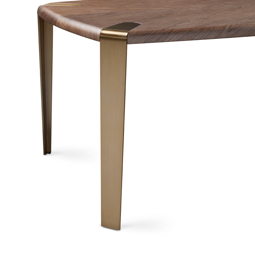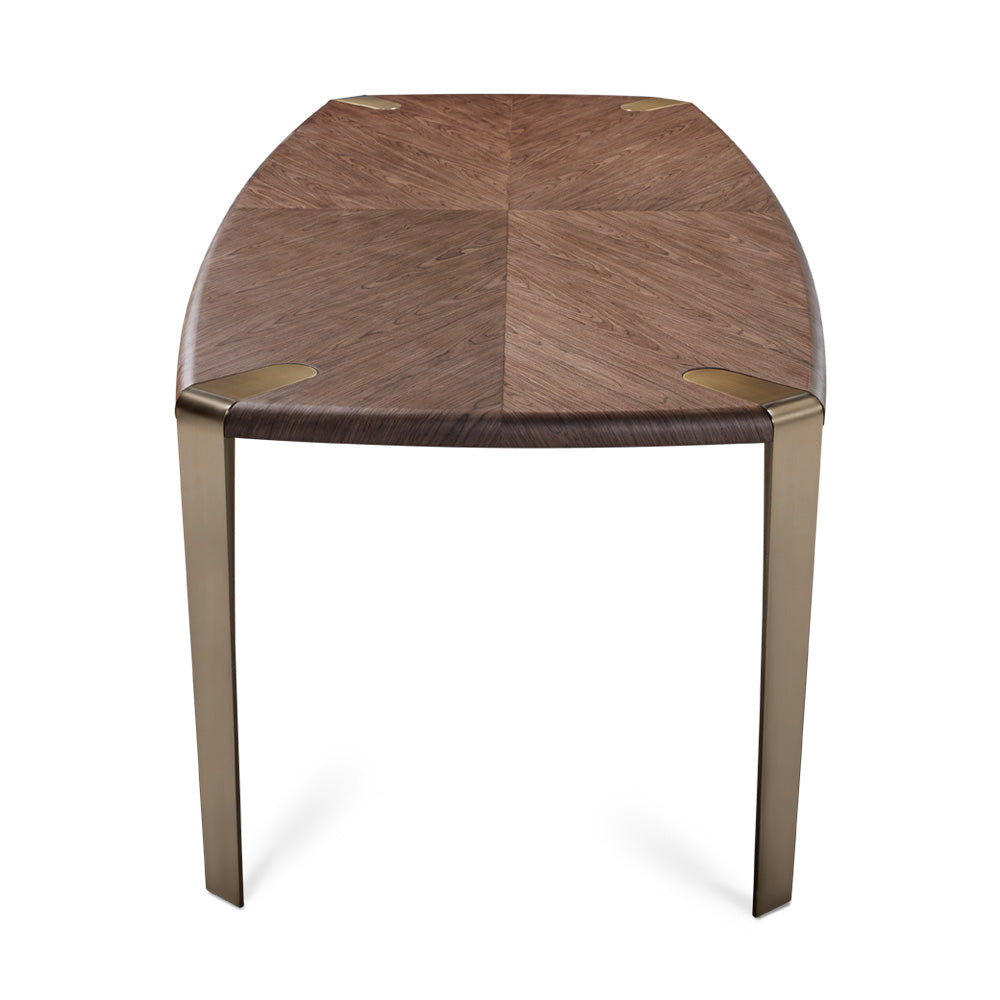 The Melody Dining Table boasts a harmonious blend of natural charm and contemporary elegance. Its solid wood top exudes warmth and character, showcasing the unique grain patterns and durability of the wood. Complementing the rustic top are the brushed bronze steel legs, which add a touch of sophistication and modern flair to the table's design. This combination of materials creates a striking visual contrast, making the Melody Dining Table a standout centerpiece that seamlessly integrates into various interior styles, from farmhouse chic to industrial loft. Perfect for gathering family and friends, this table offers both functionality and aesthetic appeal, enhancing any dining space with its timeless beauty and sturdy construction.