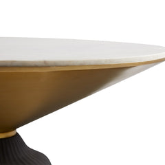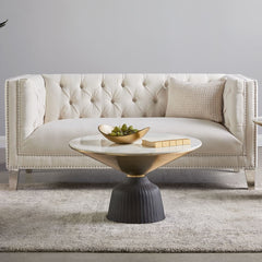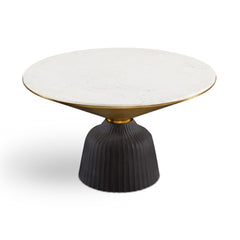 Elite 3-tone midcentury modern design. The Caterina marble coffee table boasts an impressive mixture of textures. Stemming from a ribbed black metal pedestal that blooms into a smooth brushed gold support for the marble top. Choose to admire in a formal living room that is off-limits, or use it to the maximum functionality with the matching side accent table.