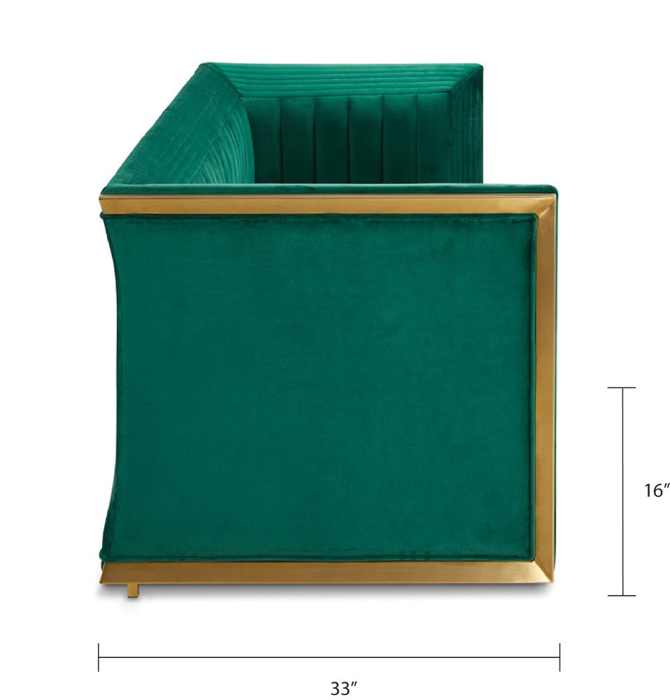 When it comes to comfort, the Kingsley sofa in emerald green velvet is the epitome. Luscious velvet fabric wraps around the entire sofa with no loose ends to show and no fuss. A brushed gold frame gives structure and adds a modern flair to an otherwise extremely versatile piece. Instantly brighten any room with this refreshing pop of color. Pair it with the matching Kingsley accent chair in green velvet to create a vivid home decor space.