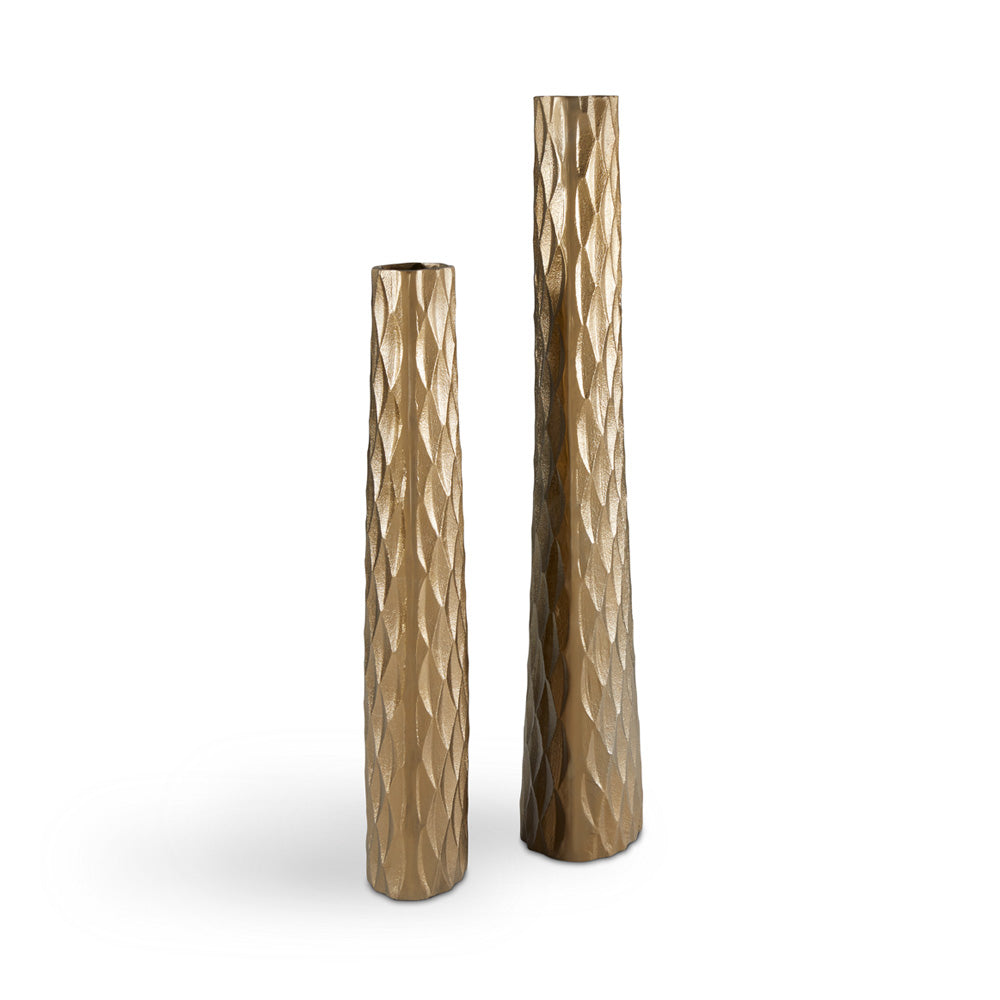 Unique slender body covered in hand-carved rhombus detailing in a refined antique brass finish. For spaces that need a layer of subtle glam, the Kite antique brass floor vases does exactly that.