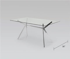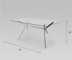 Generous in size and versatility, the Lilian dining table is designed for gatherings. Stunning polished stainless steel base which has legs extending on a slight angle from the center plank in a K-shaped design. The rectangular tempered glass top completes the airy and modern look. Achieve high-functioning perfection in your kitchen, dining, or lounge areas.