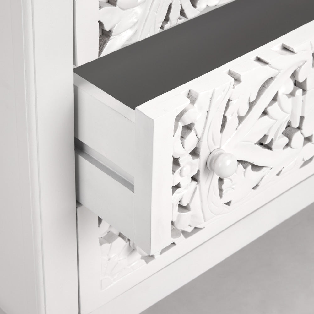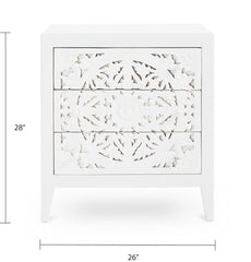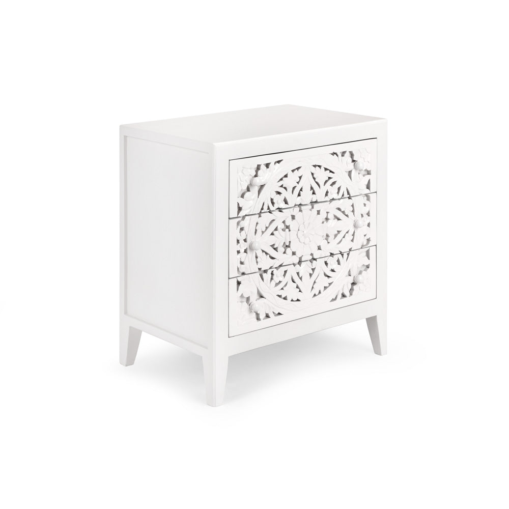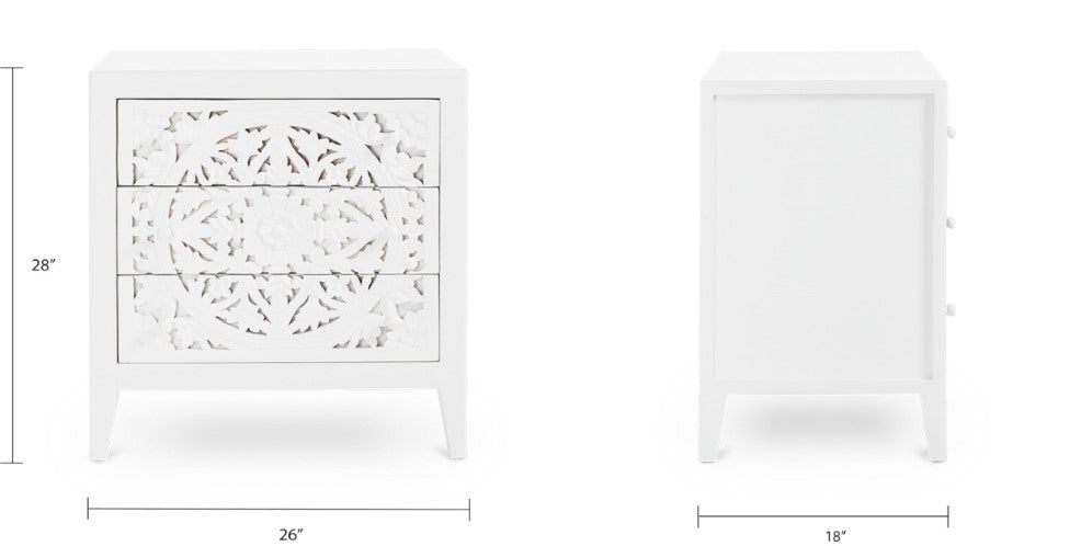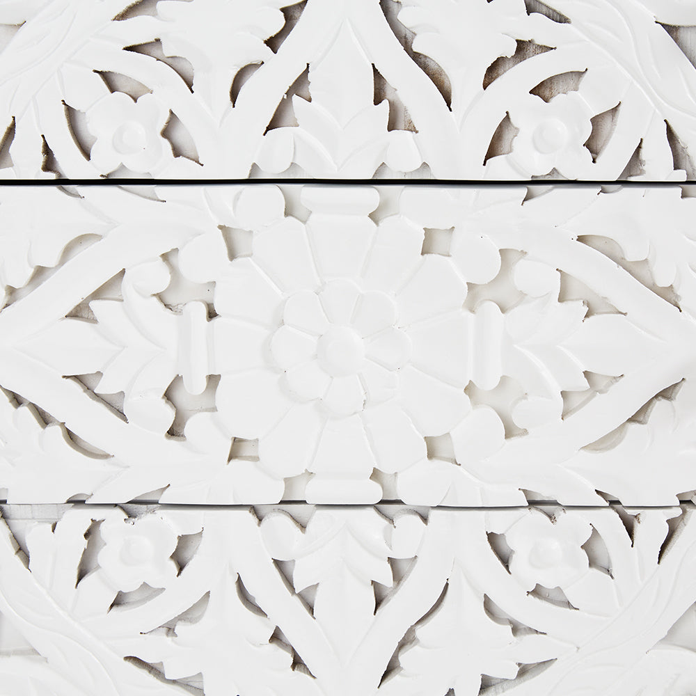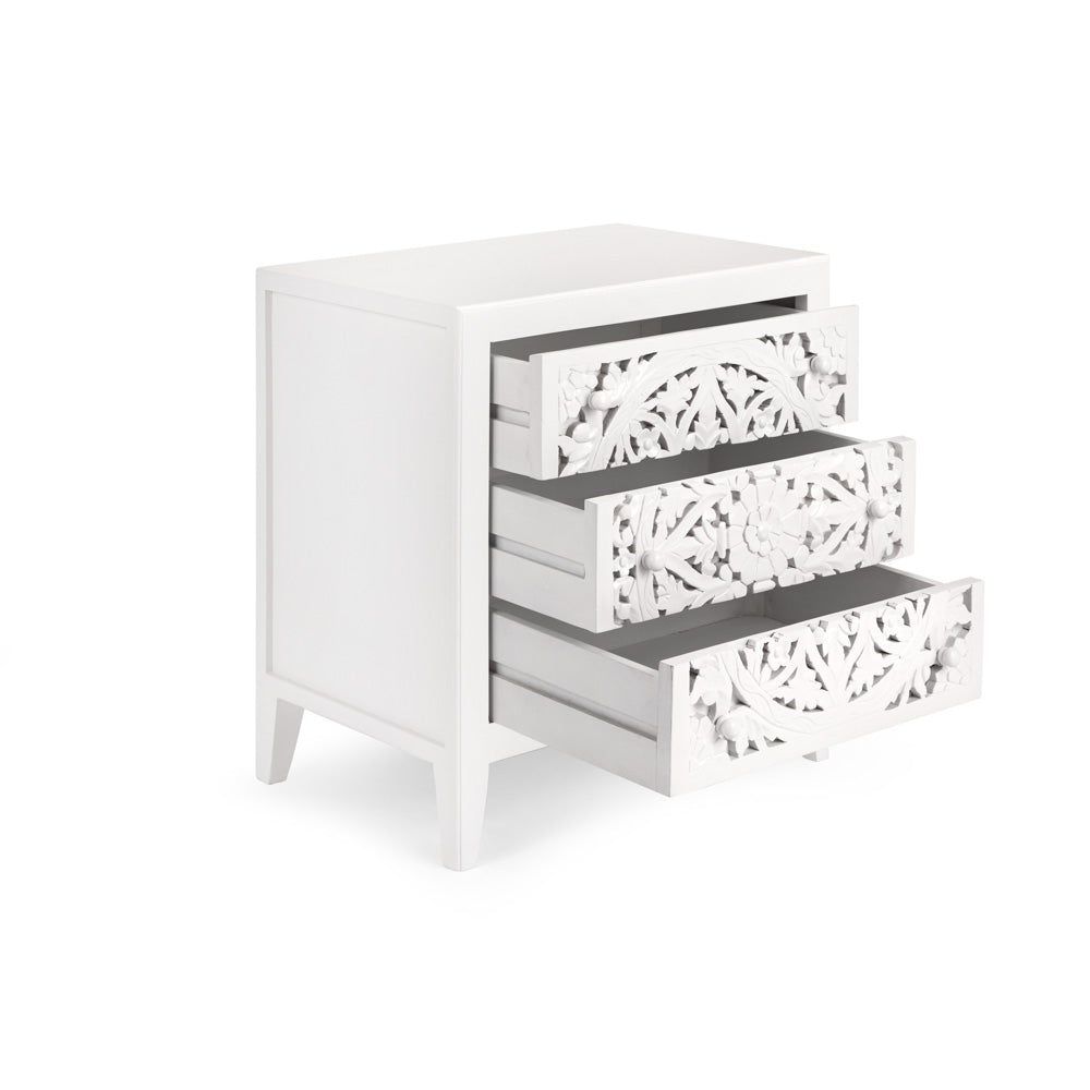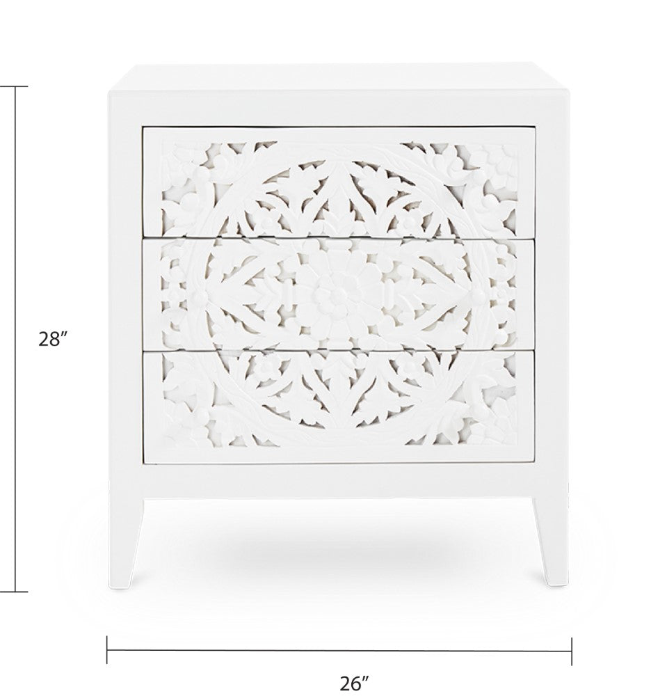 Handcarved from solid wood, the Nola Wood Nightstand is an impressive piece to display in your home decor. The intricate symmetrical carvings create stunning shadows and offer an organic warmth that soothes the atmosphere of your living space. With 3 drawers, there is ample storage space to use as a nightstand or home organizer. The Nola Wood Handcrafted collection includes a dresser, bed, nightstand, and sideboard.