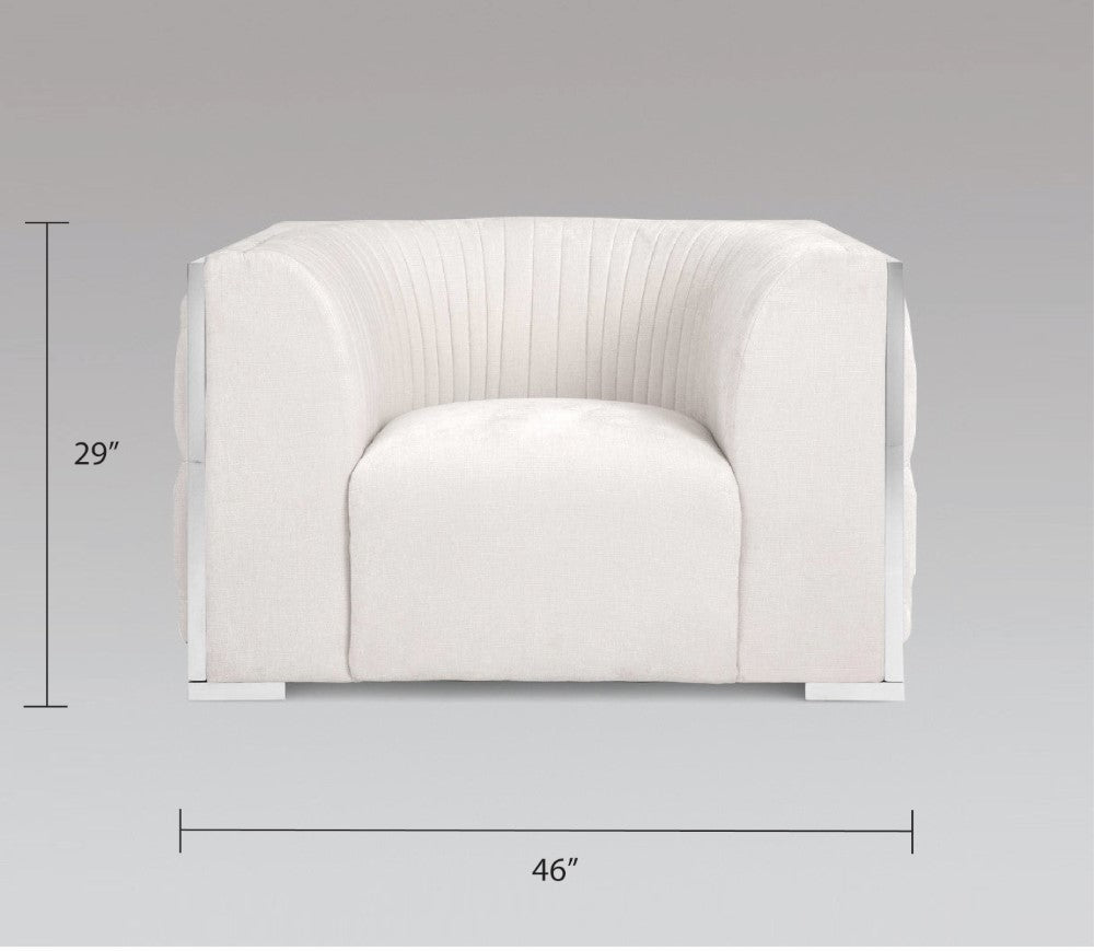 Effortless and divine. A finely balanced piece using modern design with contemporary influence makes the Socorro accent chair. Made with premium and durable materials to provide an irresistible feel and ease when it comes to loving your home decor. Classic button tufting adorns the side panels along with crisp vertical stitching and subtle steel accents. An all-around winner for versatile furniture. Wrapped in a delectable Contessa Vanilla fabric.