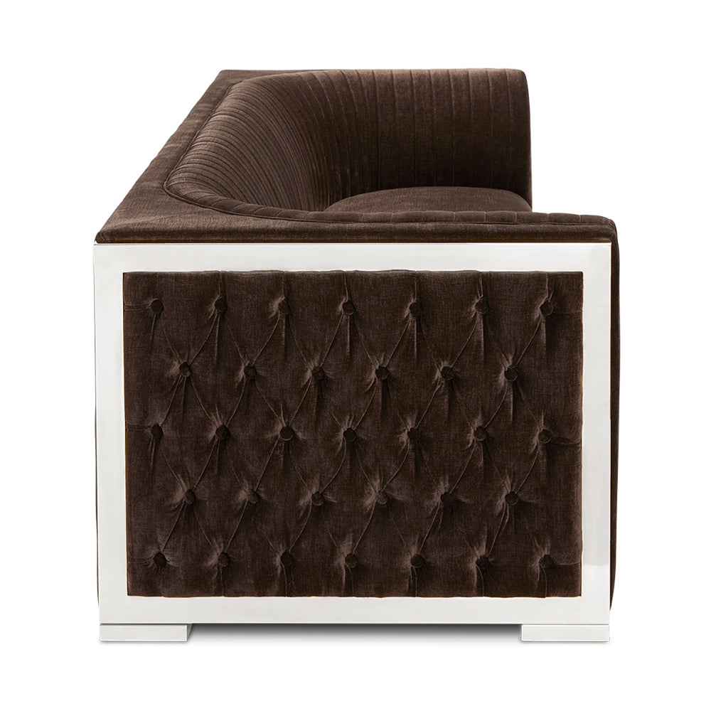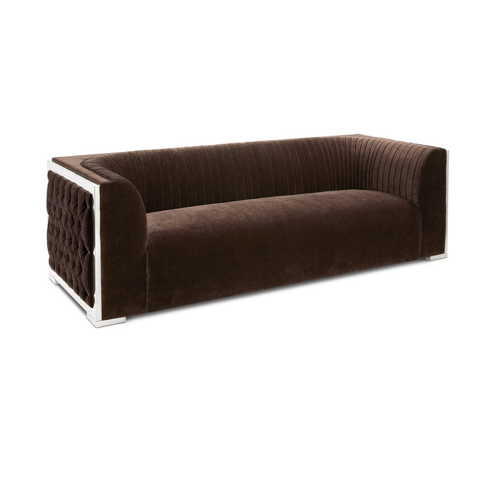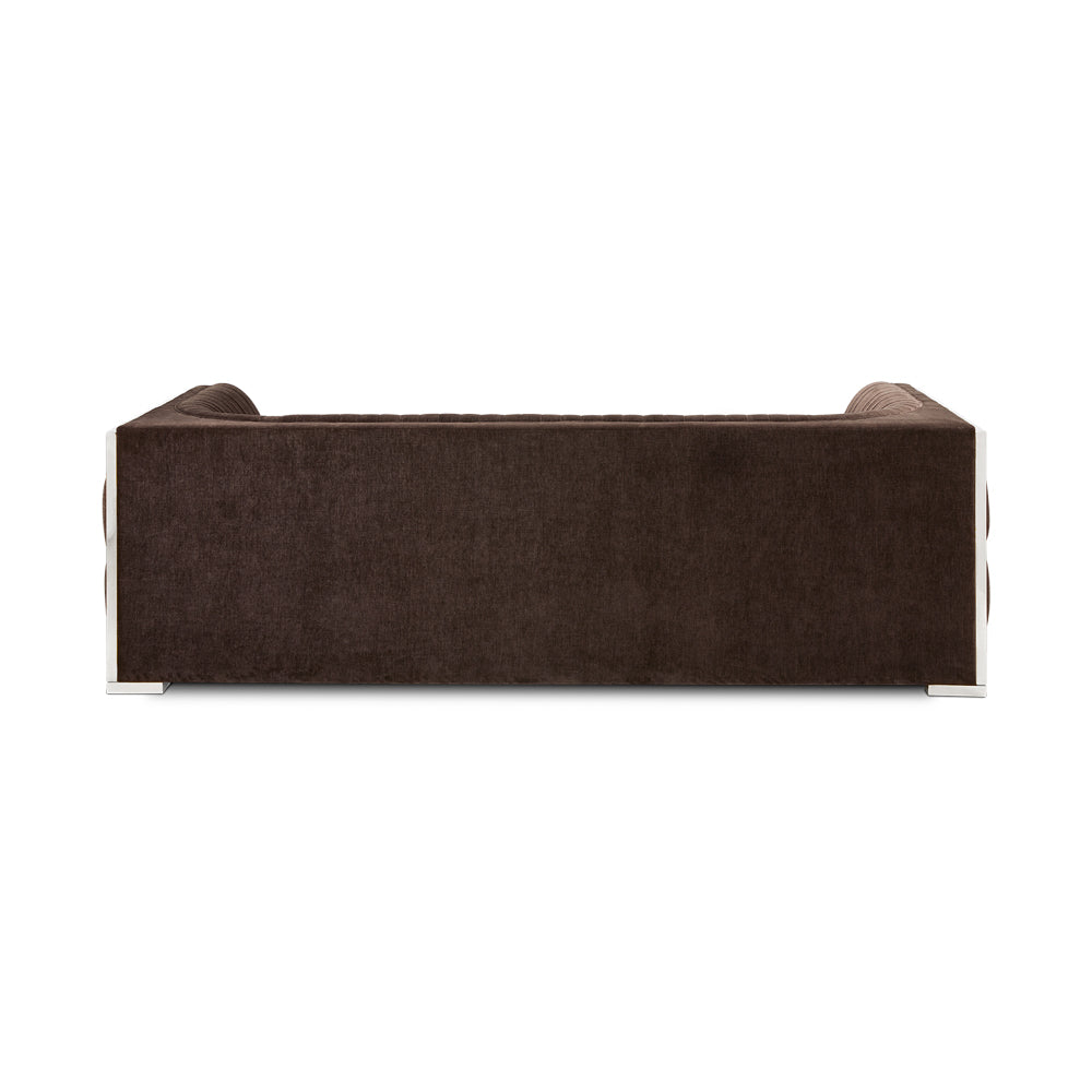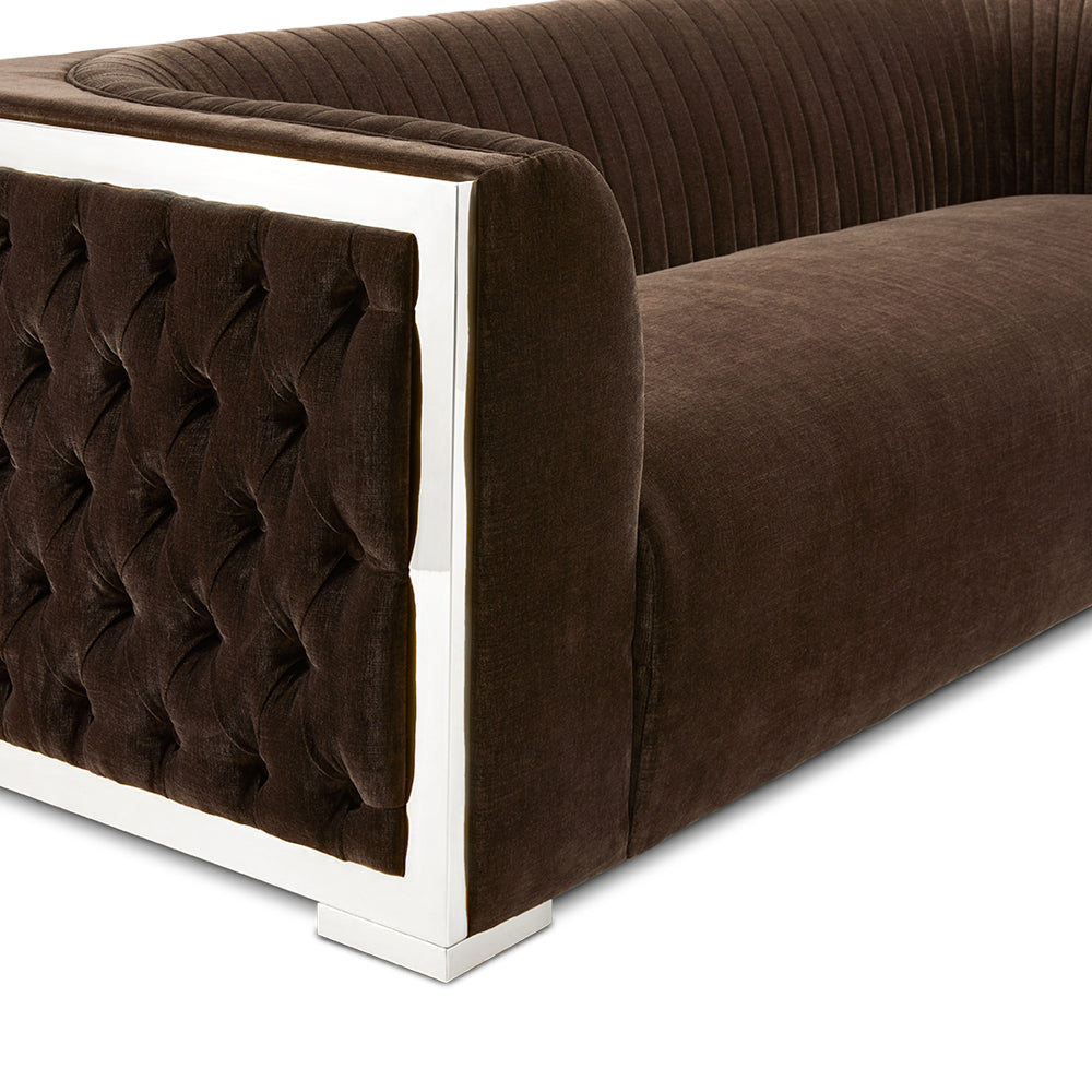 Effortless and divine. A finely balanced piece using modern design with contemporary influence makes the Socorro Java-Silver Sofa. Made with premium and durable materials to provide an irresistible feel and ease when it comes to loving your home decor. Classic button tufting adorns the side panels along with crisp vertical stitching and sublime gold steel accents. An all-around winner for versatile furniture. Wrapped in a delectable chocolate Java fabric.