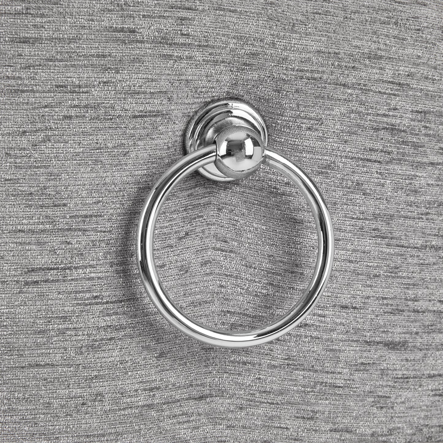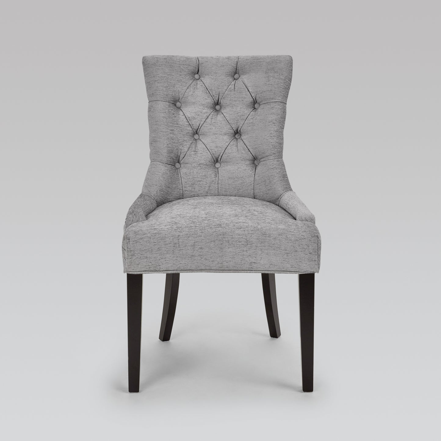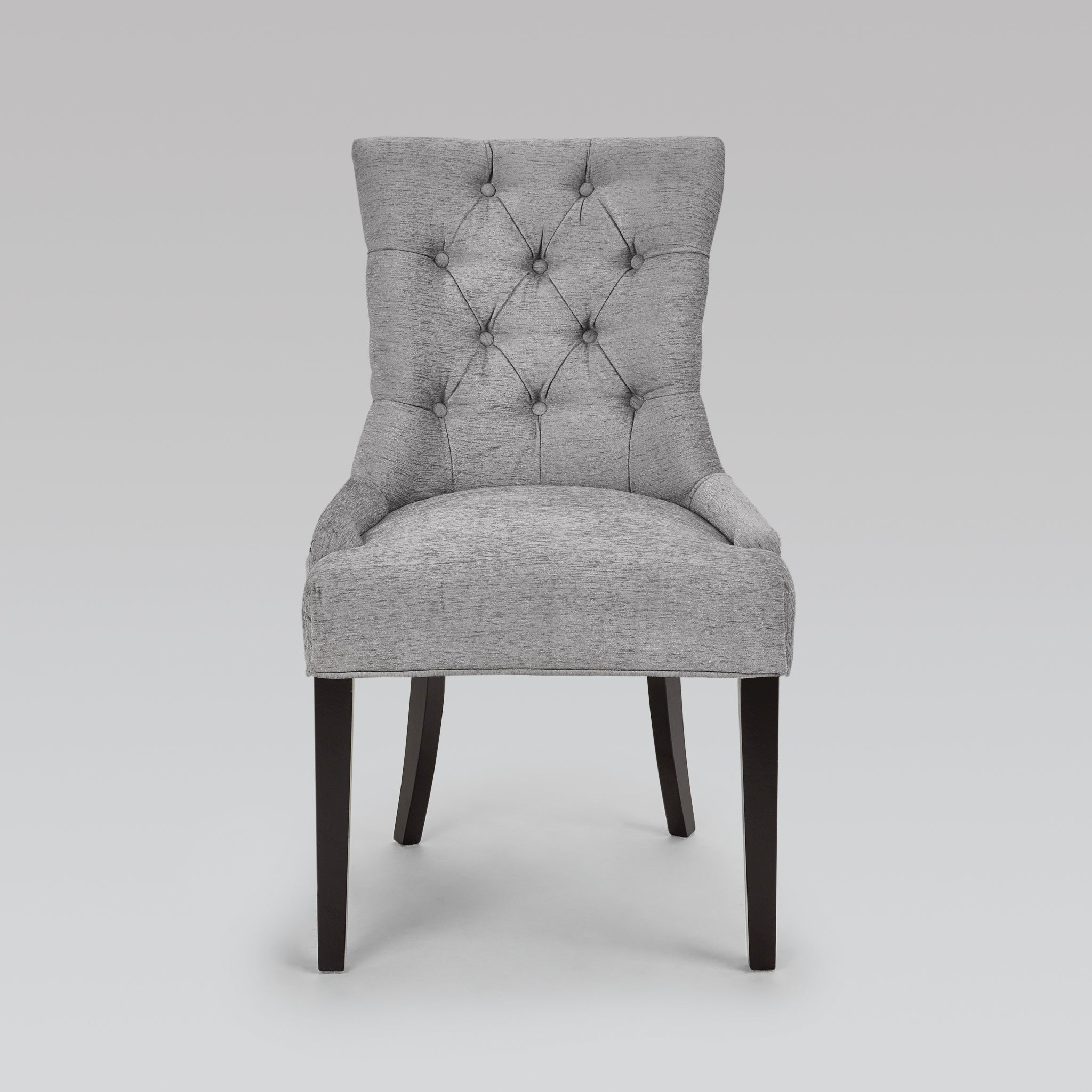 Classically designed Placid dining chair with button tufting on the seat and trimmed with nailheads along the sides. For an added touch of elegance, the back features a polished stainless steel ring knocker. Solid wood legs in an espresso finish provide sturdy support and add a complete look to the sleek contemporary design.