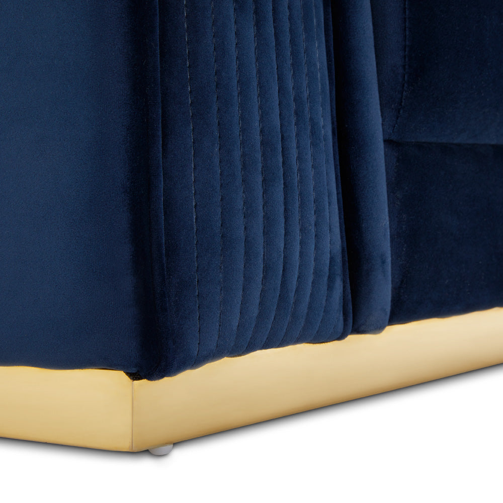 Sure to make a statement, the Tova blue velvet sofa looks good from any angle. Adorned in a lusciously rich blue velvet fabric that stretches from edge to edge and is contrasted by stunning slabs of hand-polished gold stainless steel fashioned around the sides. This piece comes with its own personality and is longing to be the focal point of an equally unique space.